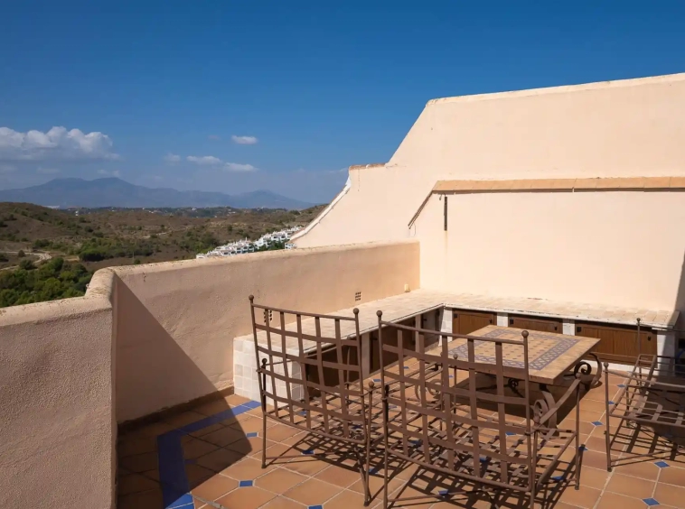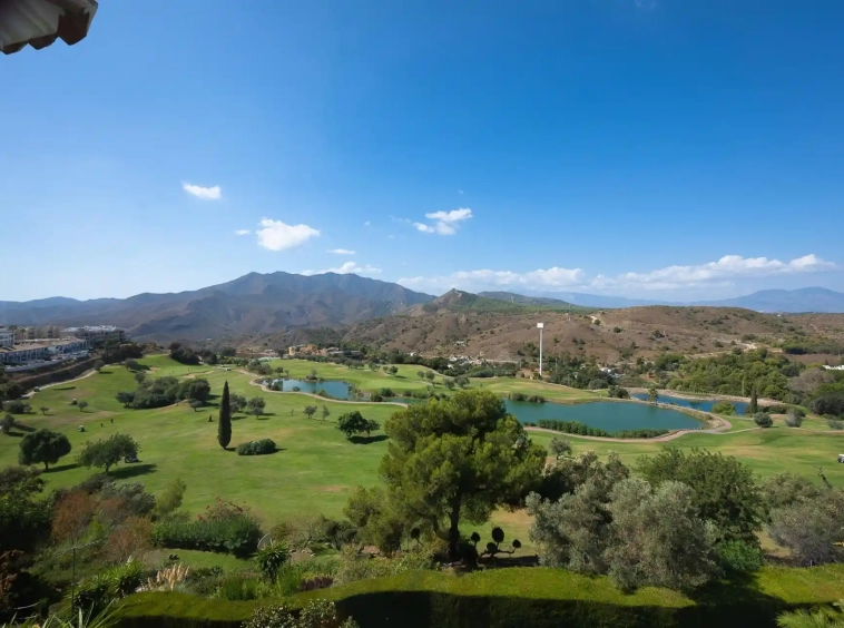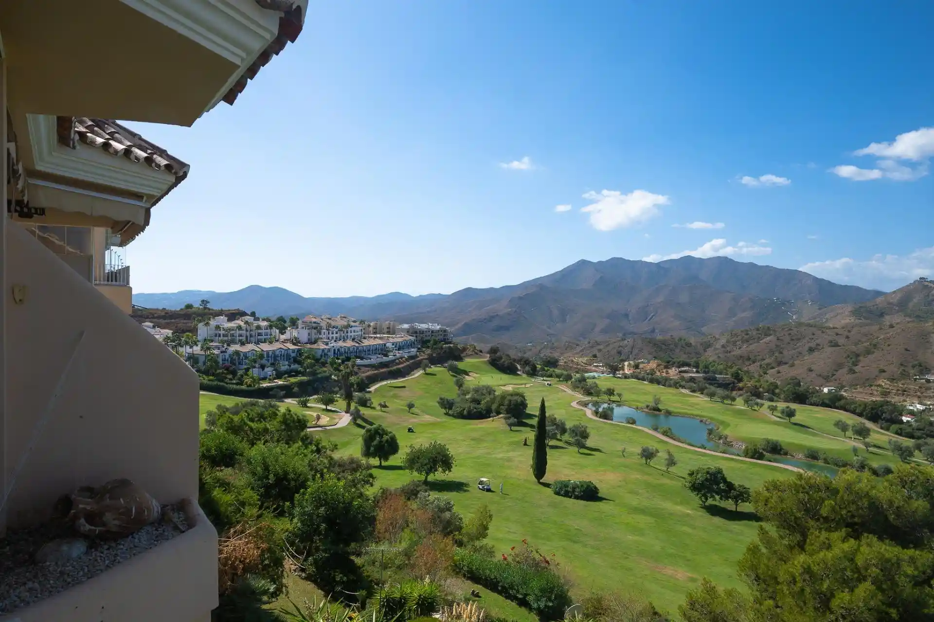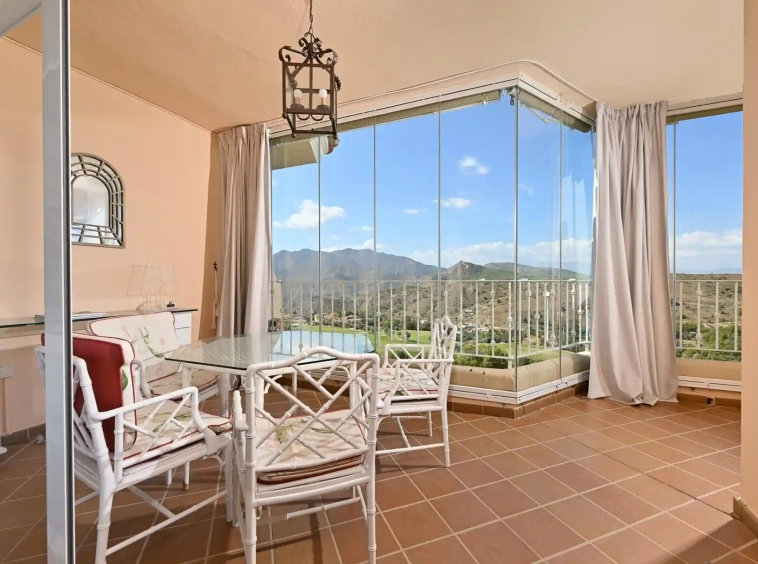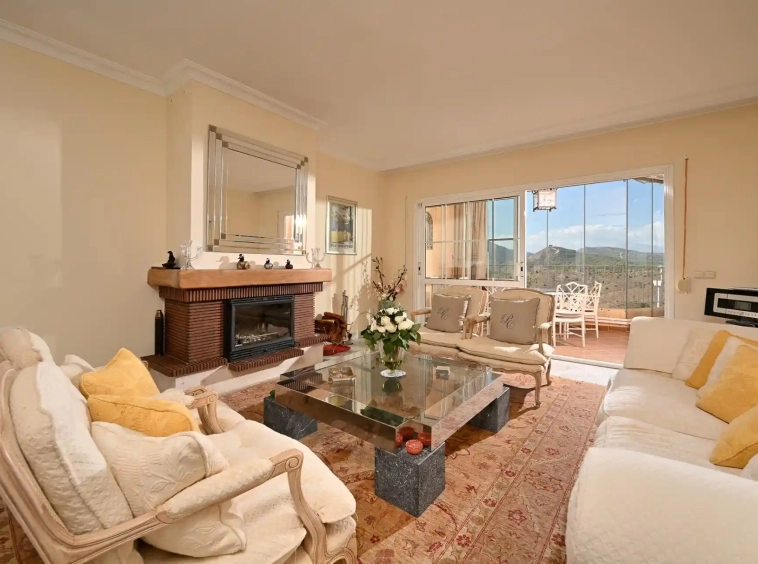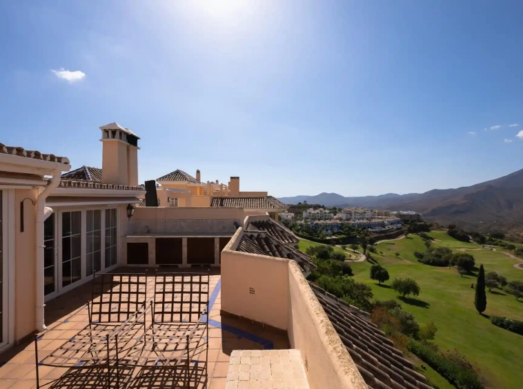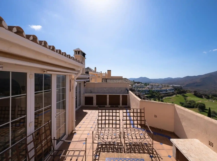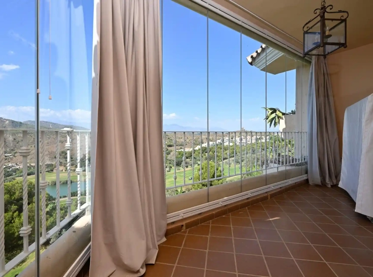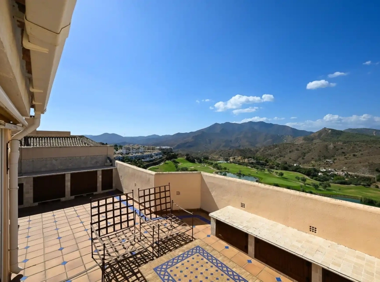 Stunning duplex in Alhaurin Golf with exceptional views of the golf course and in impeccable condition. The spacious property comprises a large living-dining room with a fireplace, opening onto a fabulous and spacious fully glazed terrace with spectacular panoramic views of the course. There is also a large, fully equipped kitchen, as well as two double bedrooms, one of which is en suite with direct access to the terrace, and a second bathroom. Upstairs, there is a third bedroom and another bathroom, plus a second summer living room, ideal for family gatherings. From here, you can access a beautiful terrace with a barbecue area and unbeatable 360º views. In addition, there is a parking space, storage room, swimming pool, and communal gardens. A property with great potential and many possibilities.