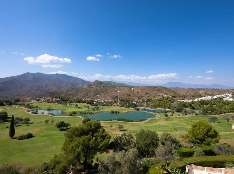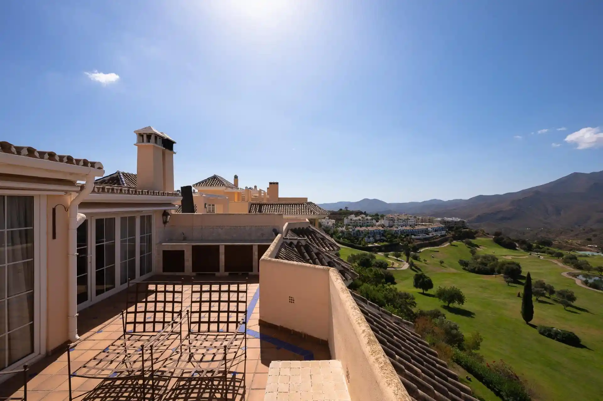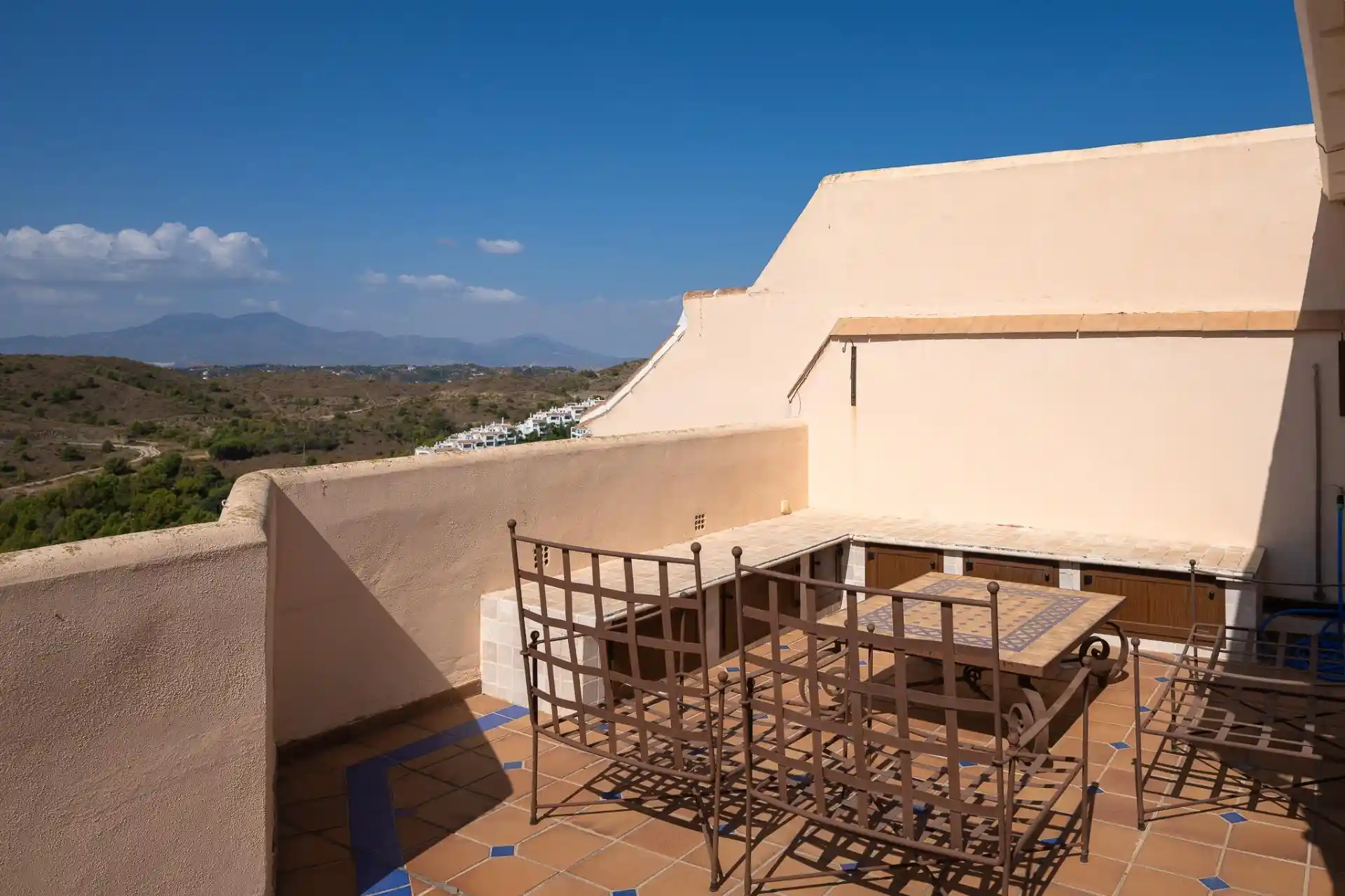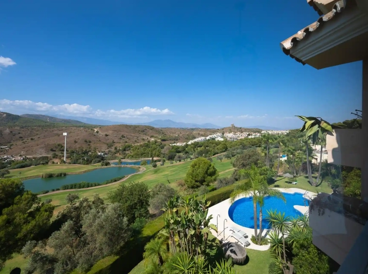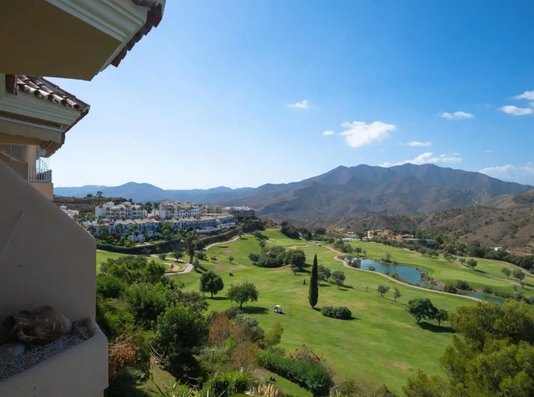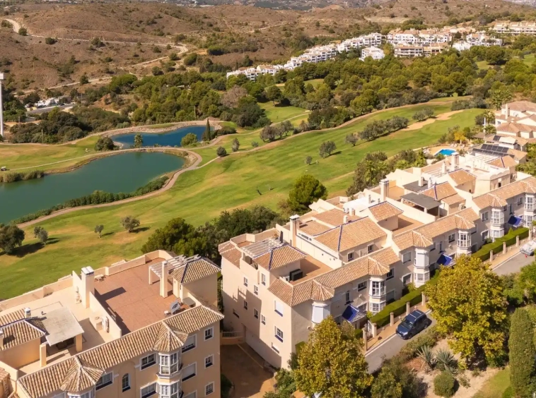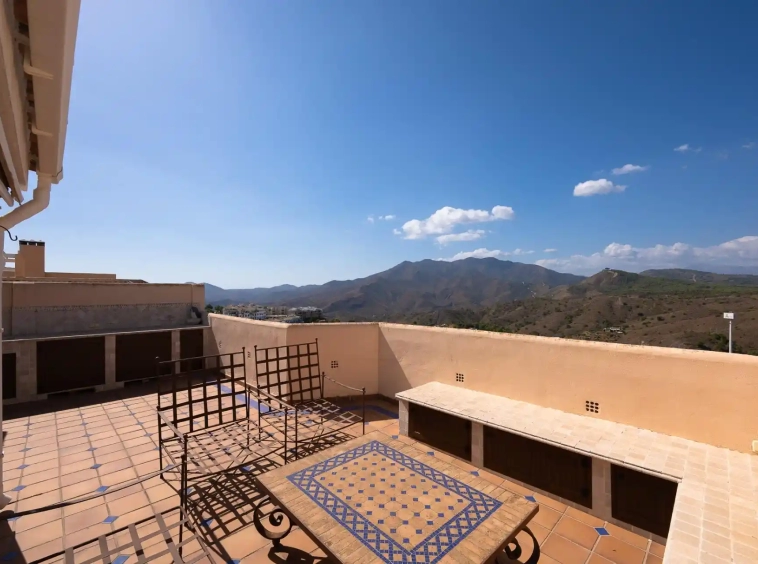 Stunning duplex in Alhaurin Golf with exceptional views of the golf course and in impeccable condition. The spacious property comprises a large living-dining room with a fireplace, opening onto a fabulous and spacious fully glazed terrace with spectacular panoramic views of the course. There is also a large, fully equipped kitchen, as well as two double bedrooms, one of which is en suite with direct access to the terrace, and a second bathroom. Upstairs, there is a third bedroom and another bathroom, plus a second summer living room, ideal for family gatherings. From here, you can access a beautiful terrace with a barbecue area and unbeatable 360º views. In addition, there is a parking space, storage room, swimming pool, and communal gardens. A property with great potential and many possibilities.
